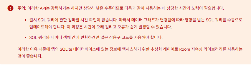 위와 같은 이유로 구글에서는 SQLite 대신 Room 사용을 권장하고 있다.
