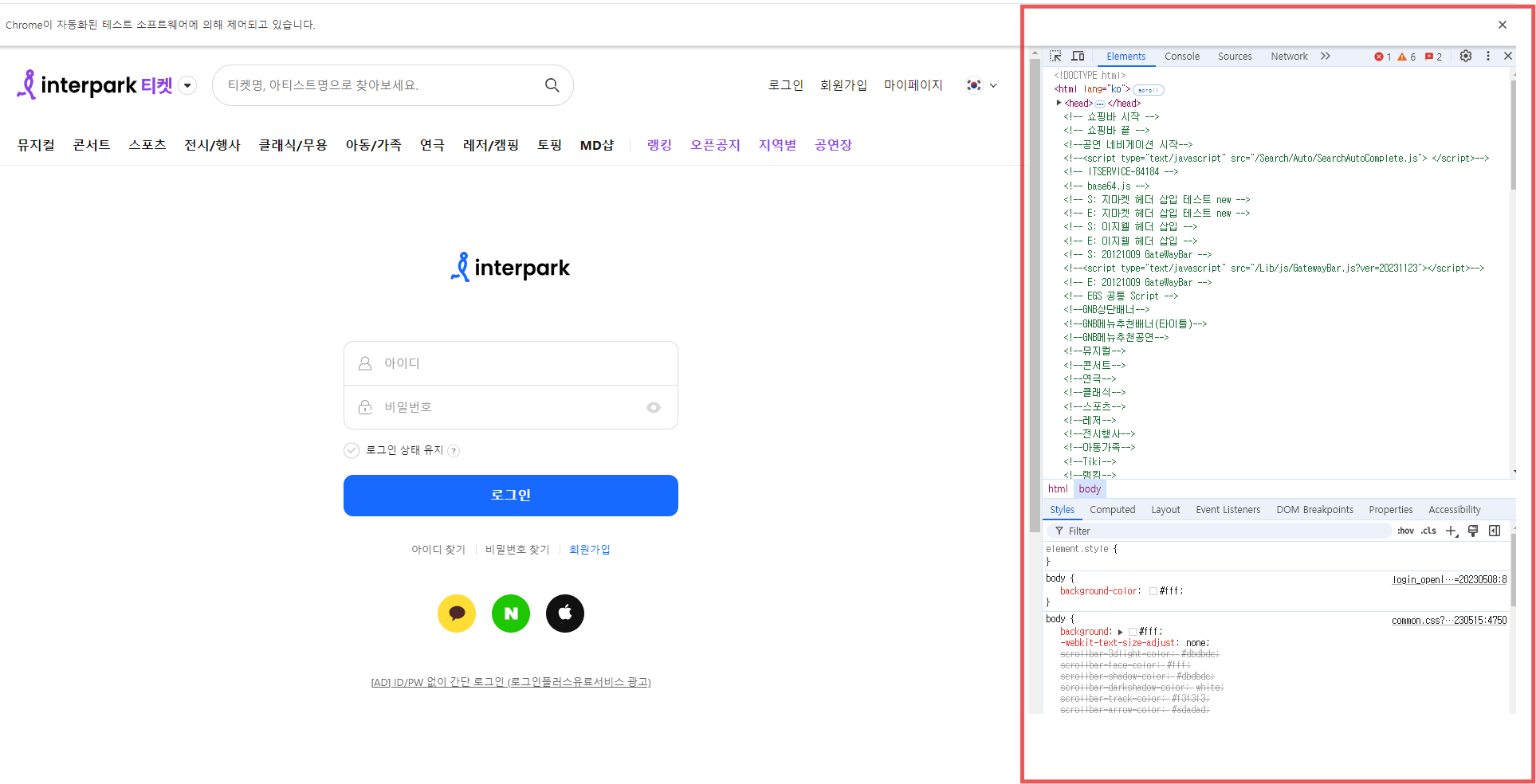 인터파크 로그인 창을 열었으니 로그인을 시도함.