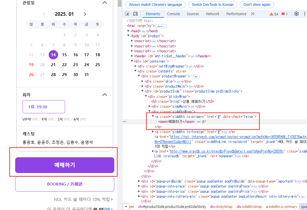 개발자 도구를 이용하여 예매하기 버튼의 구성을 확인 해보면 위와 같이 되어 있음을 알 수 있음.