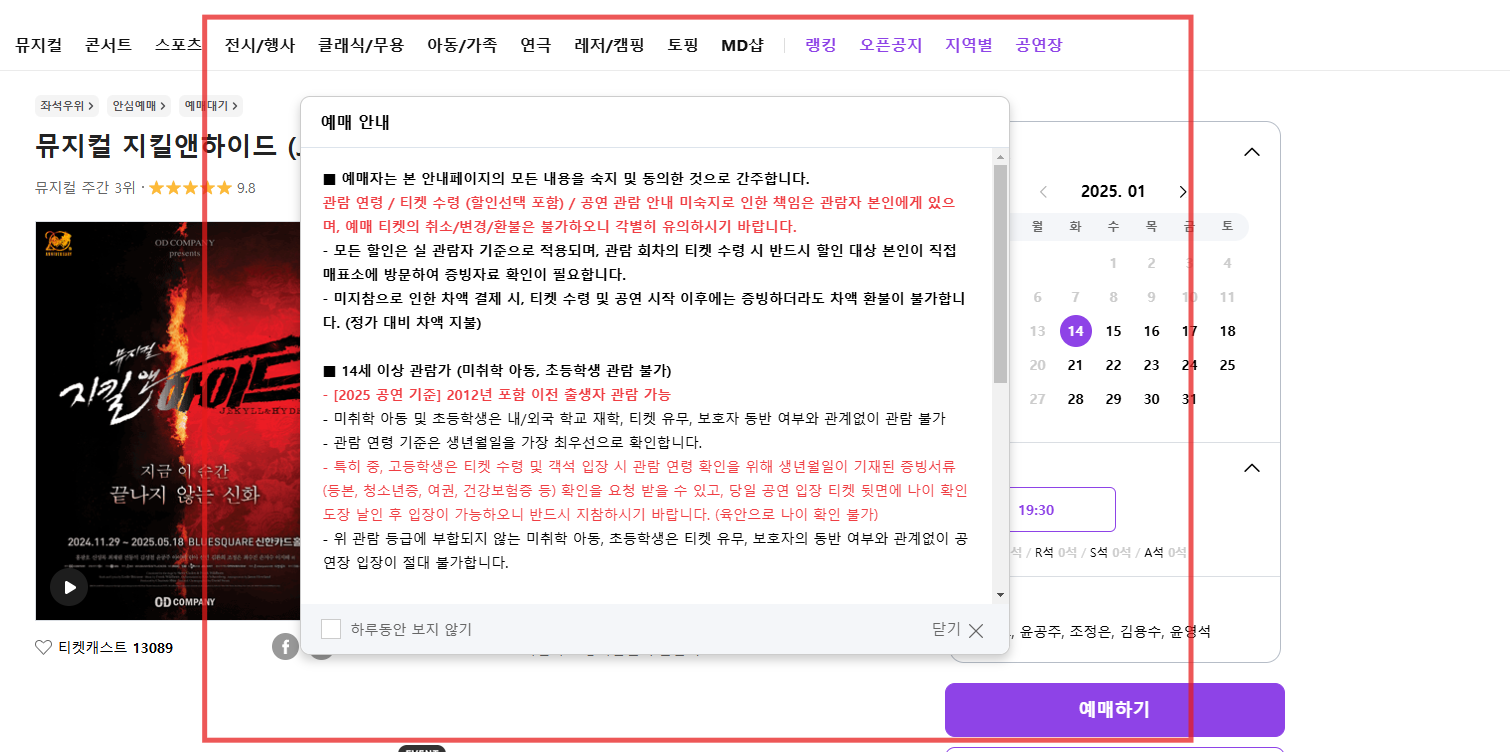 공연 예매 페이지 별로 아래 사진과 같이 예매 안내 팝업이 뜨는 경우가 있음.
