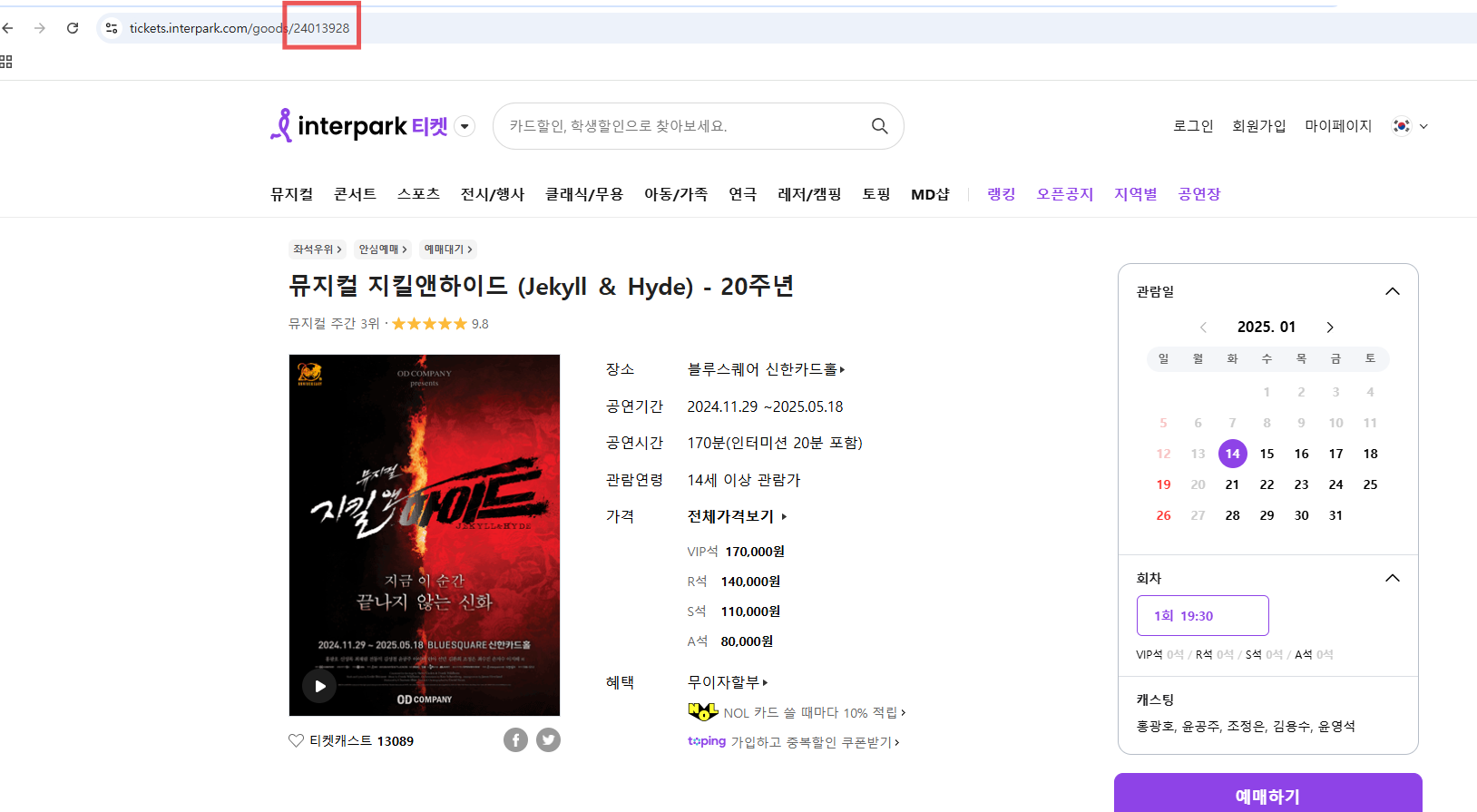 아래 예시인 지킬앤하이드의 상품번호는 '24013928' 라는 것을 알 수 있음.