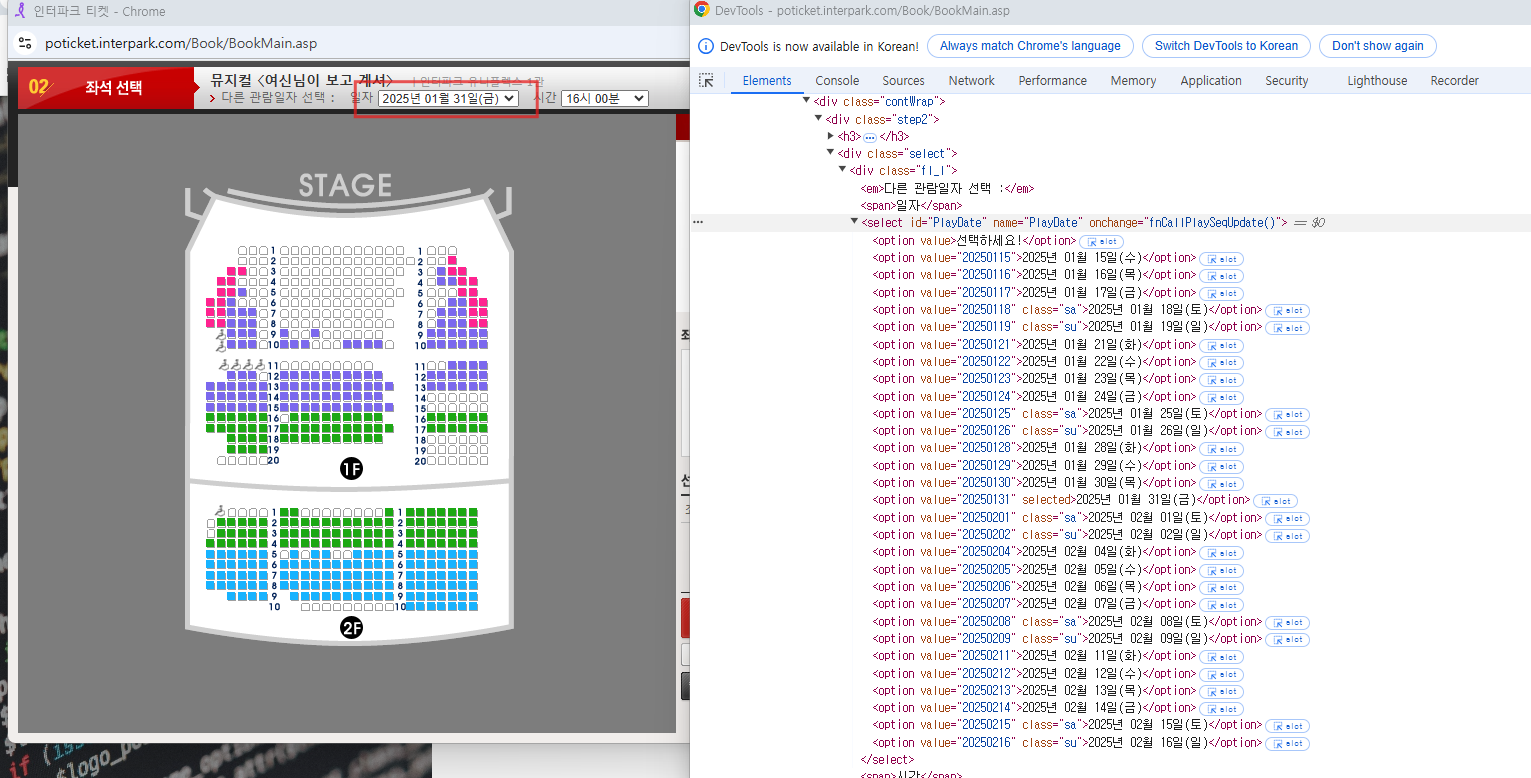 좌석선택 화면에서 날짜 선택은 select로 되어 있는 '일자' 와 '시간'을 찾아서 선택 할 계획임.